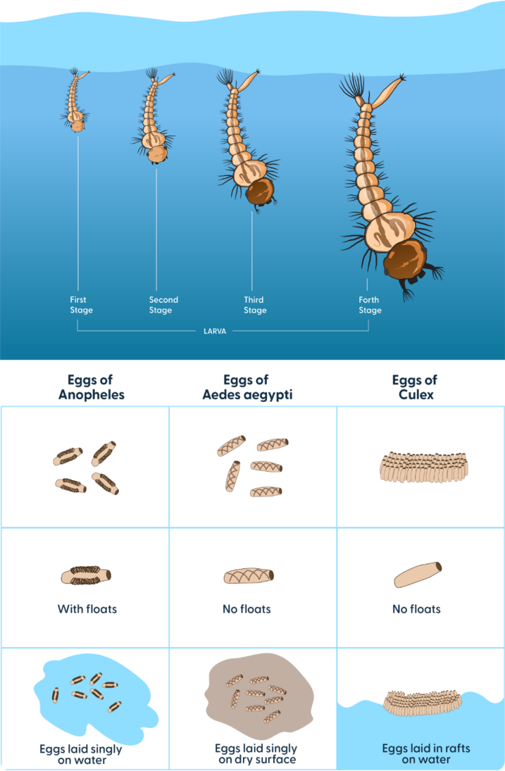 - Larva – often called 'wigglers' due to the way they move through the water. Mosquito larvae are aquatic and are active filter feeders, living in the water column, however they do still require surface oxygen to breathe.